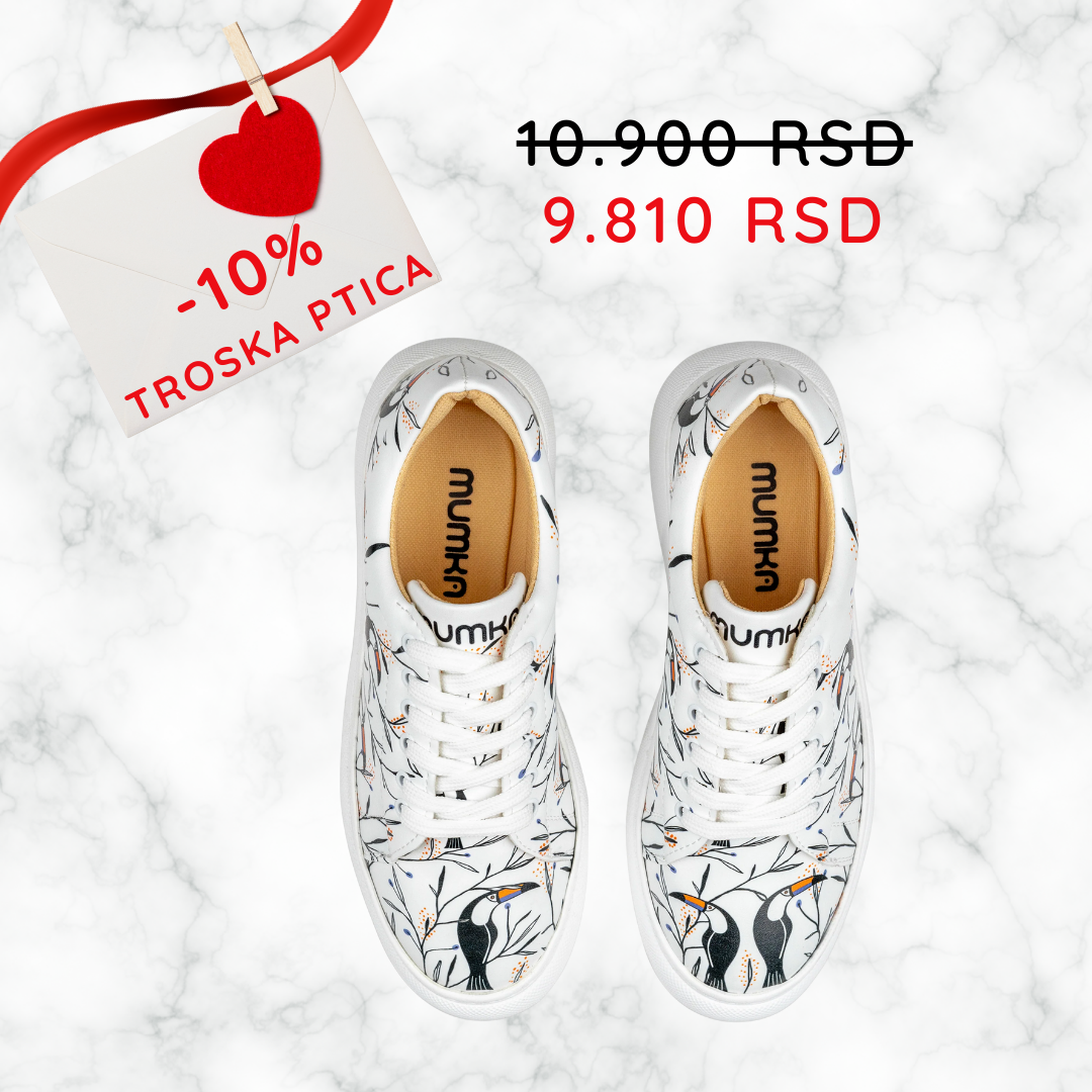 U srcu džungle, tropska ptica sa sjajnim i živopisnim perjem širi svoja krila i peva pesmu života — radosnu, slobodnu, neuhvatljivu. Njeno perje sija kao sunce na nebu, a svaki ton koji ispusti nosi poruku: budi hrabra, budi svoja, zasijaj u boji. Sada tu pesmu nosiš i ti — na svojim patikama.