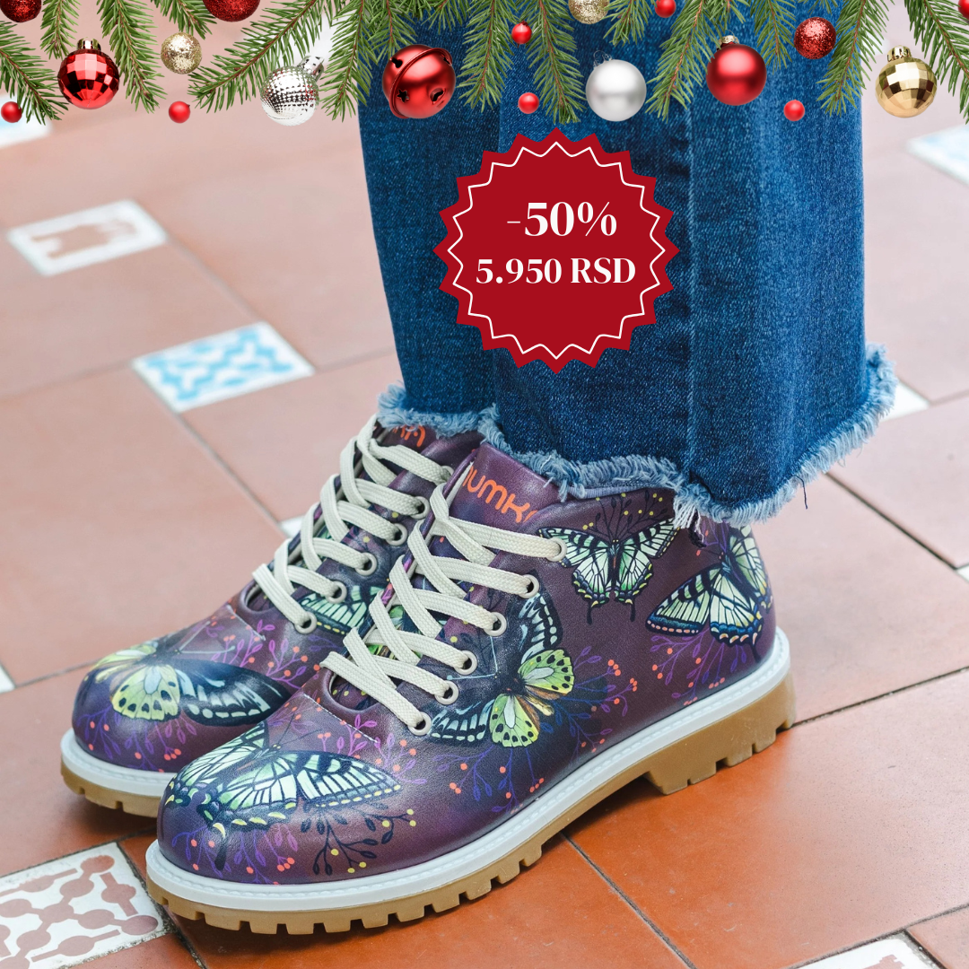 Ove cipele svedoče o putovanju ličnog rasta i razvoja koje svako od nas proživljava. Leptir, sa svojom neverovatnom sposobnošću transformacije, postaje simbol te promene. Njegov životni ciklus — od neodređene gusenice, preko faze kukuljice, do veličanstvenog leptira — odražava našu unutrašnju snagu. Ova metamorfoza oslikava duhovno putovanje koje svi delimo, dok se prilagođavamo, učimo i evoluiramo kroz izazove i radosti života. Svaka faza donosi nova saznanja i iskustva, vodeći nas ka potpunijem razumevanju sebe i sveta oko nas.