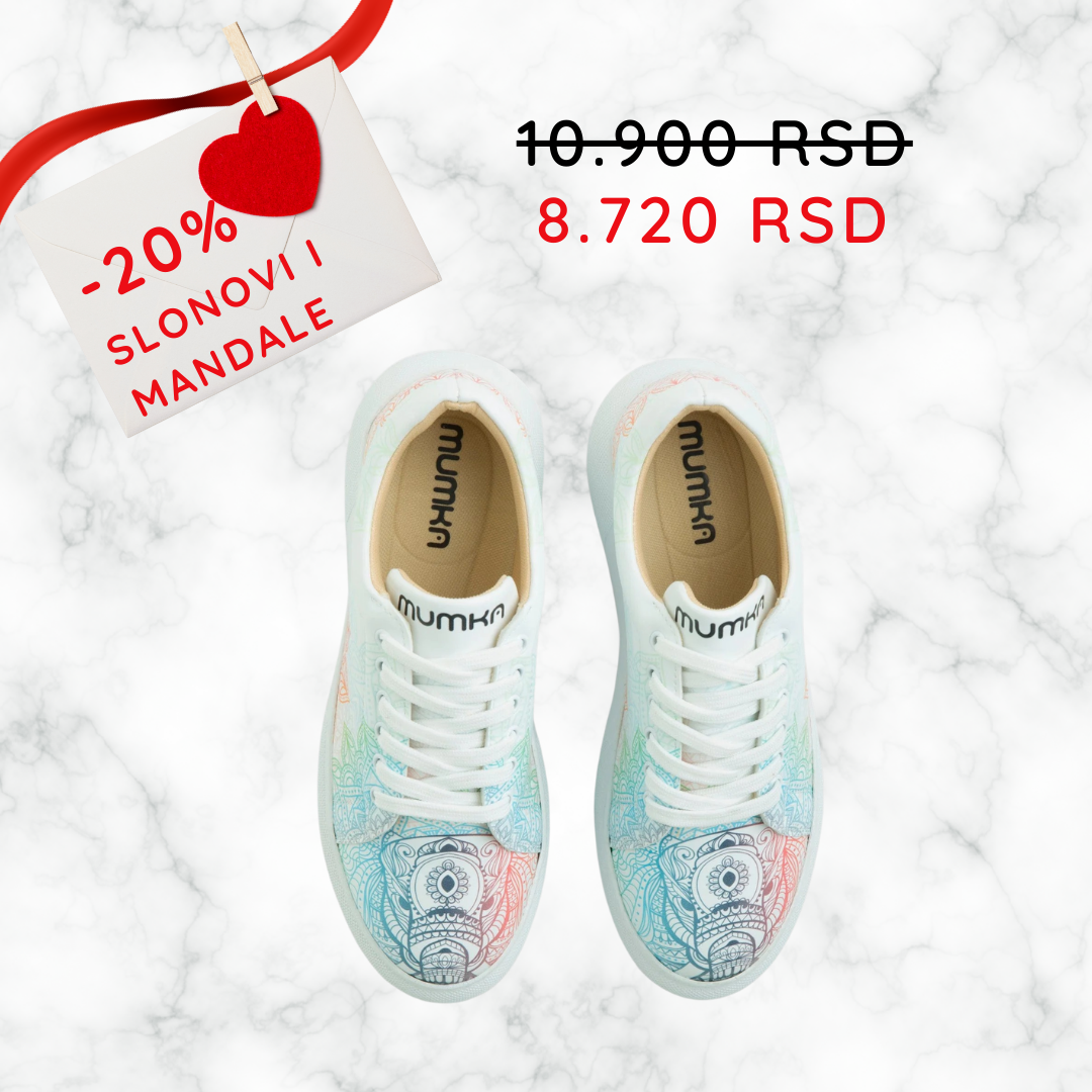Mandale su kružni dizajni koji se koriste u različitim kulturama i duhovnim tradicijama kao alati za meditaciju i predstavljaju jedinstvo, celovitost i harmoniju. Mandale su moćni simboli ravnoteže i duhovnosti. S druge strane, slonovi izražavaju inteligenciju i snagu. Oni predstavljaju sreću, zaštitu, snagu i porodicu. Zamislite šta sve možete izraziti sa svakim korakom dok nosite patike sa mandalama u boji i slonovima.